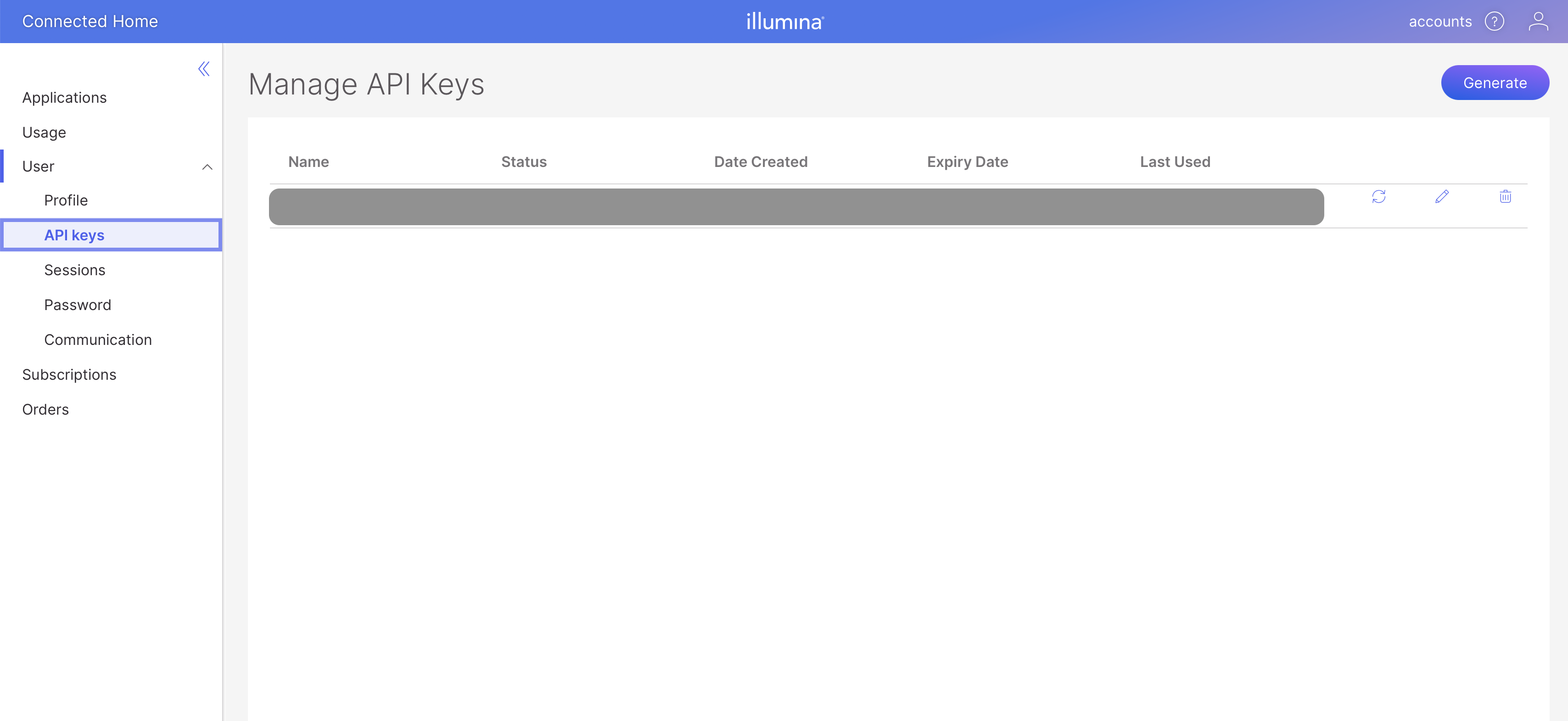 To use Illumina Connected Annotation and its utilities, users have to create an Illumina API key. To generate the API key, users are required to create Illumina public account which can be created freely from this page.